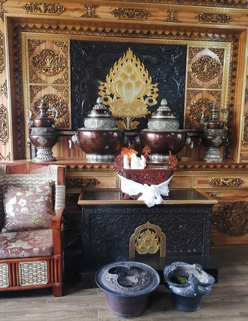 墨脱北高南低,从南伽巴瓦峰到边/境线海拔相差7000多米,造成了中国最完整的垂直气候带谱,生长着从寒带到热带的各种植物,包括许多珍稀物种。在墨脱藏族是少数民族,主要是门巴族和珞巴族。这十几年来zf下了不少力气,接通了电力、通讯、电视信号和公路,建设学校医院,开发旅游,使墨脱脱了贫。格拉丹东大酒店看起来还不错,玻璃幕墙,房间不大,装修简单,但想到运输那么艰难,能达到这个水平不易了。不远处有个公园,一汪湖水给当地增添几许清秀,这里海拔1100多米,很舒服。本地出产一种特殊的石材,从石器时代就被用来做锅用,成就了特产墨脱石锅和名菜石锅鸡。据说这种皂石绵软、不粘、保温、传热快、富含微量元素,石锅直桶造型,颜色灰白,分量很重,一只售价少则一千多,多则好几千。吃过午饭上山去仁青崩寺,这路就更不像路了,工人正在施工扩路,各种工程车忙碌着,我们经过他们就得让路,实在让不开我们就等着。历尽艰辛到了寺前,我顿感失望,院门破旧,油漆斑驳,院里面房屋更是破败凌乱,主体建筑既不高大,也不豪华。多吉和陪同八姆却一致说这个寺在整个林芝是最/灵的,地位极高,他们都以能来该寺一拜为幸事。据介绍仁青是宝物的意思,崩是多的意思,我理解就是聚宝盆。说从上面看周围的山包围着这座山像莲花一样,因此又叫莲花圣地。寺里真有个宝物,上千年历史的铜鎏金佛塔,比寺本身还古老,不知来历,20来厘米高,塔顶可以掀开,看到里面的佛/像,非常精致。寺是地震被毁后1983年重修的,一座单体建筑,外面看三层,内部两层,在正方形结构上每边向外凸出一块,好像四个门的门廊,这样就形成了12个角,别致轻巧。寺里主供莲花生大士,面目狰狞,我很不解,当地人解释说这是莲花生的八种变相之一,在造福众生的同时也需要降伏鬼怪,他曾在墓地修行多年,这可能是他与其它出家人不同之处。莲花生博学多才,神通广大,于八世纪从印度将佛教传入西藏,主修了桑耶寺,可以说藏地的所有僧众都是他的学生。