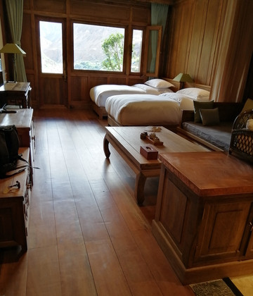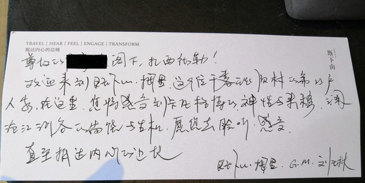 果然没再遇到烂路,借着月光和白马雪山的反光一路顺利到了德钦,儿子在岔路口接上我们到酒店。挨个扫健康码、输入身份证信息又花了好长时间,进到房间11点多了。这家既下山梅里SUNYATA度假酒店是个日本留学的重庆设计师的作品。有日式简捷低调的风格,很多留白,房间很大且都有落地窗,三楼公共空间视野宽阔,晴朗时能看到梅里雪山。缺点是没有电梯。早餐和酒店差不多模式,品种少些,也还算用心。晚餐要预订,要吃鸡还是鸭或是牛肉和酒店说,他们去采购,但不一定能买到你想要的,所以预订只是意向,他们会做调整,吃什么怎么吃基本上还是他说了算。每人100元管饱,和第一天的庄园差不多。我们订了第二天的晚餐,主菜是烤鸭和炖鸡,还有几道炒菜,味道都很不错。整体来说员工们挺努力。进到房间看到茶几上一张手写的欢迎卡,那手漂亮的小字让我顿生好感,但两千多一晚的价格有些不值。