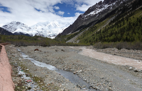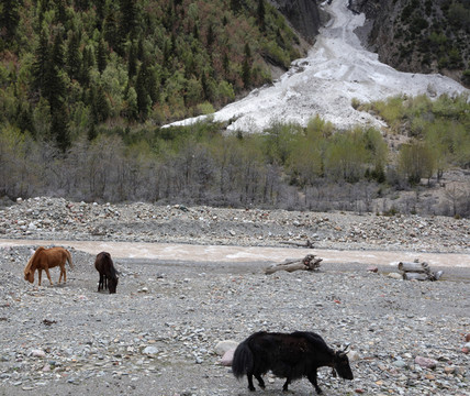 中午在附近的一家牦牛肉火锅店吃饭,牦牛肉很嫩没一点膻味,一同炖的萝卜更美味,入口即化,大家一致夸赞,再配上自带的白酒花生米,这顿饭是这一路最令人难忘的一餐。下午和儿子俩去明永冰川,其他人去看白马雪山。到达冰川大门口已过三点,买了门票和电瓶车票(共102元),车可以节省我们六公里路程,司机将我们送到一个小亭子边说最晚五点回到这里,他送我们下去,晚了就没车了。我们沿木栈道向上爬,尽管这里海拔只有2000多,还是气喘吁吁,开始一段树林密且高,看不到天,再向上到了山坡边上,树少了花多了,开得正娇艳,可以看到对面山上的几道小冰川,过了一段比较缓的和毁坏的栈道来到一个玛尼堆,就看到从卡瓦博格主峰倾泻下来的漏斗型冰川。天气不好,山顶和天空融为一体,一片灰蒙蒙。时间有限,我们只好返回,据说再往前走也没有更好的景色。一路上只遇到两批游客共5人。到小亭子边等车,好几头驼东西的骡子和工人在这里休息,骡子身上毛皮斑驳,有的瘸了腿,有的破了皮,都无精打采的,看着可怜,与山上漂亮悠闲的大公羊完全不是一种状态。晚上回酒店两家人聚餐。