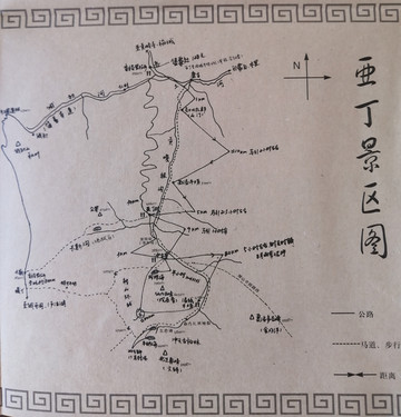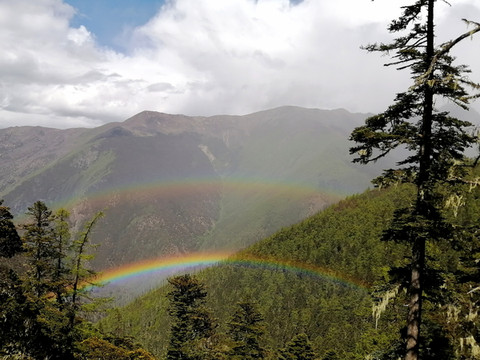 休息一晚满格复元,酒店的自助早餐很规范,中西兼备,应有尽有。王总早已备好面包车带我们进景区,还带了氧气、高原安、水、自热饭及水果和巧克力等零食,真周到呀!车在山路上盘绕,看到下面整齐的亚丁村,新建的楼房毫无特色,麦田里的图标和“YADING”字样极其醒目,据说以前是用不同颜色麦子组成的,现在似乎是画上的。车只能开到冲古寺下的停车场,这里海拔不到4000米,爬一段石阶到电瓶车总站,电瓶车最远到4180米的洛绒牛场。王总让我们沿路捡三块小石头,说到时就知道做什么了。走到一处平台,王总让我们把石头扔到道旁的小石堆上,说是三枚都不滚落下来就是有佛缘,石堆顶圆滑,不滚落挺难的,只有两三个人保住了三块石头,我自知没佛缘,石头也很知趣地掉落了。考虑到团里高龄人员比较多,团长没采纳王总的建议去牛奶海或五色海(4400米和4800米的高度挡住了去路),而是到洛绒牛场就返回了,对此王总的遗憾不亚于我们。上午天气很配合,蓝天白云,仙乃日峰清晰呈现,中午到洛绒牛场阴天了,央迈勇峰就是不肯露头,我们在休息处吃过饭它依然藏在云中,我们只好放弃。下山时兵分三路,一部分坐半程电瓶车然后走栈道,去冲古寺和直接返回的坐到电瓶车总站。等大家结束行程陆续上了面包车,开始下雨了。一路往大门开去,半路雨停了,两条彩虹像双层拱桥一样跨越山谷,甚是完美。