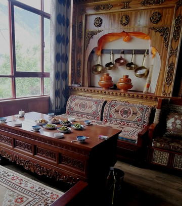 这次住宿体验了两种类型,一类是标准的星级酒店,一类是民族风格的设计酒店。标准酒店因地方不同档次相差不少,像八宿和墨脱就是招待所升级,林芝和香格里拉能够上四星,设施齐全,卫生不错,公共空间宽敞舒适。设计酒店我是第一次体验,小有惊喜,养眼是这类酒店最看重的,室内和窗外都很用心地布置,会在最好的位置设个座位,让你坐下来欣赏玩味。另外温馨的服务也是一大特点,没有统一的服装,不是标准化的服务,而是有家的味道,送些小点心、漂亮饮料,晚上摆好拖鞋,员工会跟你聊天,吃饭也是家里有什么吃什么的感觉,让你对他们的不专业和不到位不再那么介意,甚至感到亲切。但有些人就不太适应,没有个舒服的沙发,没有写字台,家具的高度不合适,等等。有一点让我很郁闷,房间钥匙巨大,铜的,还挂一堆装饰,感觉有几百克重,每天揣在身上真是累赘,可能藏族人家就是这样。