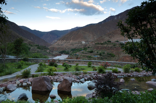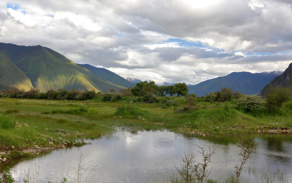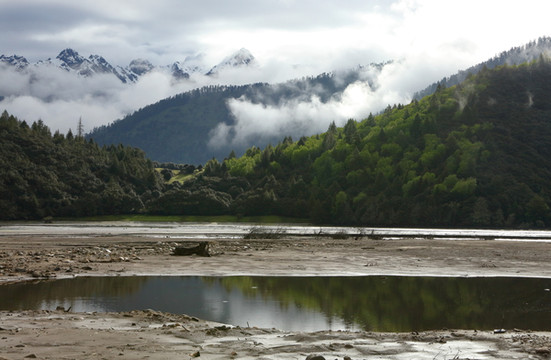 回酒店没和大家一起吃饭,我们仨又出发去河谷了,因为刚才路过时我觉得河谷很漂亮,想趁太阳没落山拍拍照。林芝沿着尼洋河而建,尼洋河在不远处汇入雅鲁藏布江。林芝下游这段河水有许多浅滩,我们费好大劲才下了公路找到一条小土路走进河滩,这路走着走着就没了。脚下是野草和野花,还有小水洼,远处是青山和雪山。只可惜云太厚,再薄点就好了。本来想走到河边,可没路太难走,又看不见周围的状况,天渐渐暗了,怕迷路就返回了。