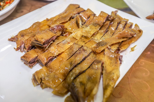 岗美腊鸭最早起源于 阳春 岗美镇,现在已有近百年的历史,村里人选用当地的麻鸭,通过生腌生用文火焗到皮脆 ,这种腊鸭具有色泽鲜艳、醇香可口的特点,是送酒的绝配。