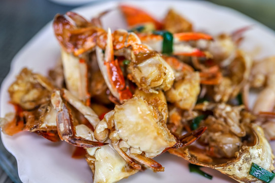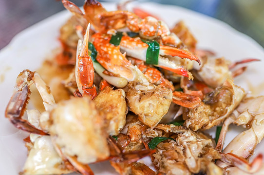 阳江 栋焗蟹就是用这种食材制作的一道地方特色美食,螃蟹主要将蟹斩件后,加入料酒和白糖,酱油等调味,然后盖上煲盖焗到蟹壳变成红色,再入少量的水,就可以食用了。