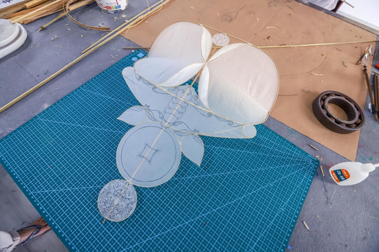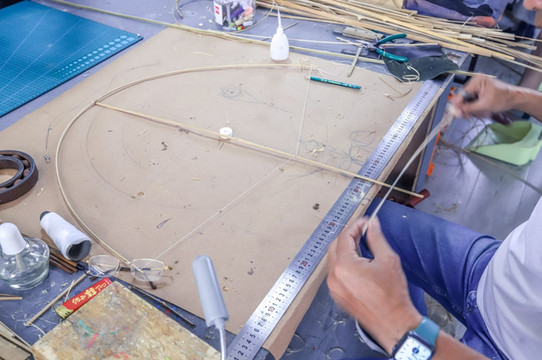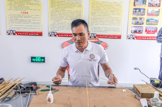 风筝制作人正在专心制作风筝,制作人熟练地用手操纵着竹条,竹条根据他的想象变换成各种曲线形状,最终他想要的风筝骨架。