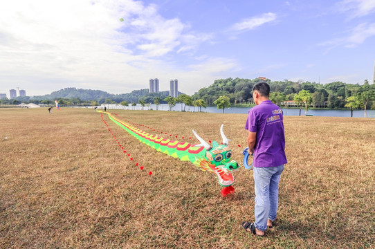 阳江 风筝的“龙头蜈蚣”腰节上用带有碳纤维的轻质材料作横担。横担的两端没有羽毛,每个腰节下面有一纸舌,随风飘动。这种风筝的设计制作采用“仿生学”原理,按蜈蚣的生态,从头到身躯、肢爪,形似传神,我手上拿着这条龙头蜈蚣长达68米长。