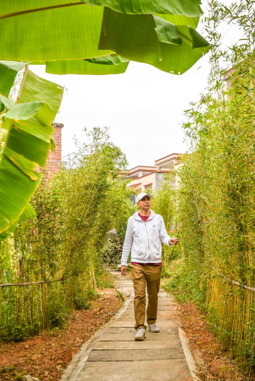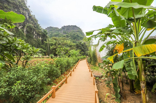 村里新修建的木栈道是村 民和 游客健身的好地方,栈道沿着湖 边和 林间延伸。右边种植有芭蕉树,左边也荷花池塘,风景蛮美的。