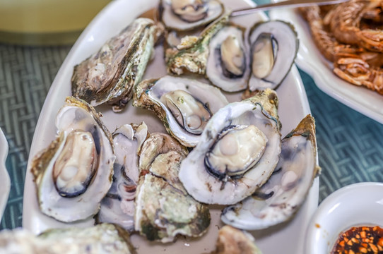 当地生蚝的吃法有很多种,有盐焗蚝、炸蚝、炭烧蚝、清蒸蚝、姜葱炒蚝,鲜蚝炒饭、生蚝煲仔蚝粥,你能想到的,这里都有,就连炒青菜,他们也会加入生蚝来调味。