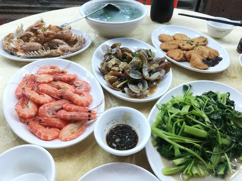 晚上的第一顿正餐,造访其他旅游攻略推荐的“锐记美食”,地址: 广东省阳江市旅游大道中77号。M团了一下价格,128的套餐(皮皮虾/花甲/明虾都是三选一自由搭配的)对我们两个人来说已经算是很丰盛了。