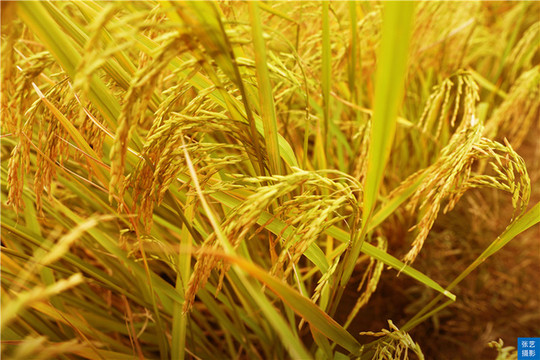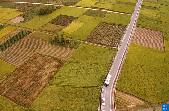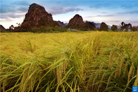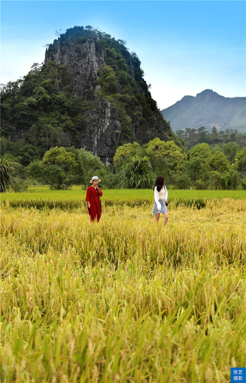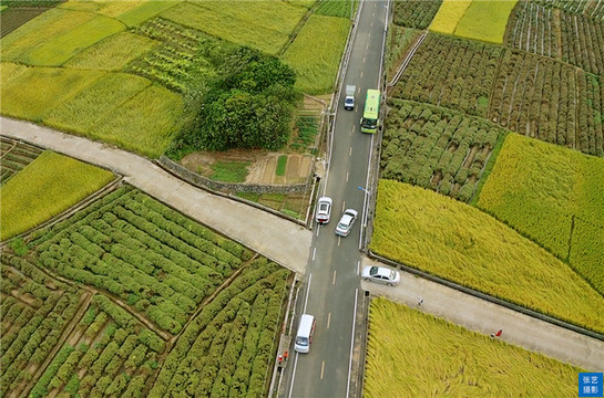 入秋稻熟,在群山环拥下,田垌有如画布,稻田的金黄主色调与绿树的苍绿副色调互相渲染,明艳夺目。