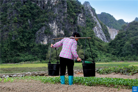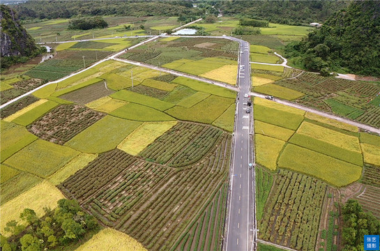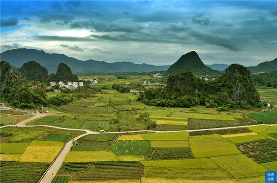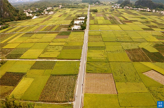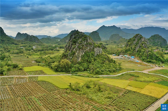 金色的稻田间出现一缕缕充满生机的青绿。那是池塘、水渠,还有村民种植的蔬果和广藿香,与四周的喀斯特山脉遥相呼应,成为马兰秋色里分外惹眼的点缀。更远处,一幢幢农家小屋掩映在稻田边、山脚下,无形中为这幅绝美的田园画卷增添了几分烟火气。
