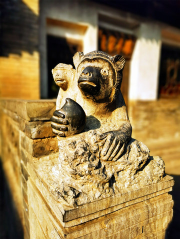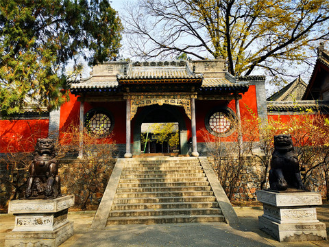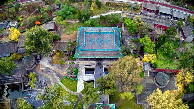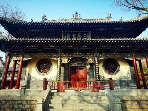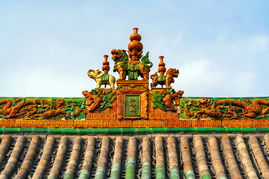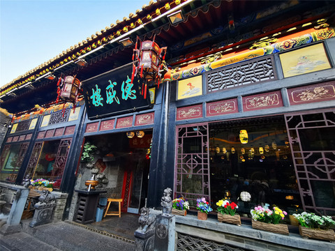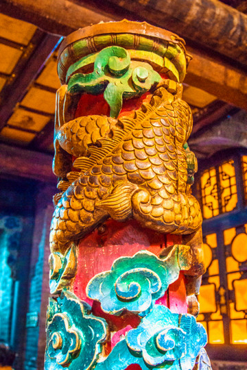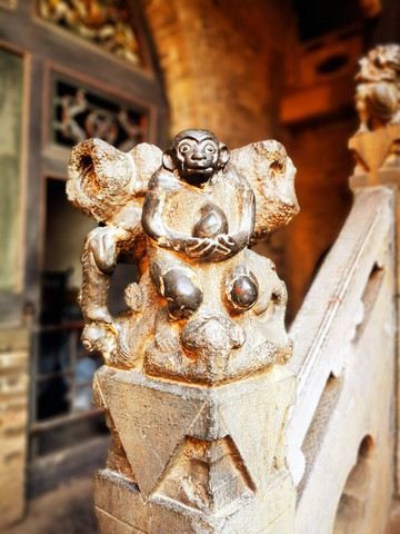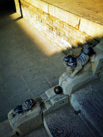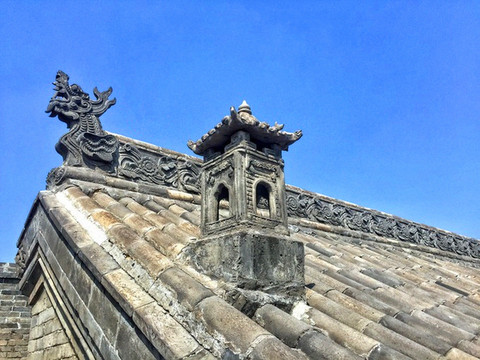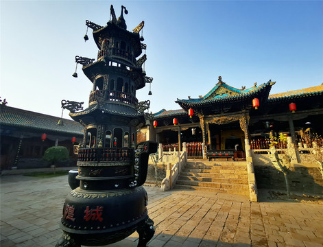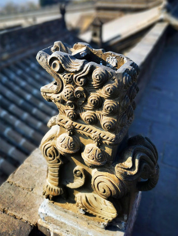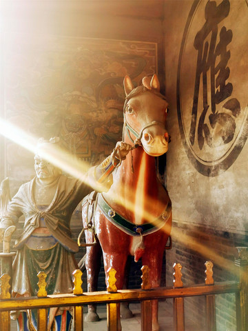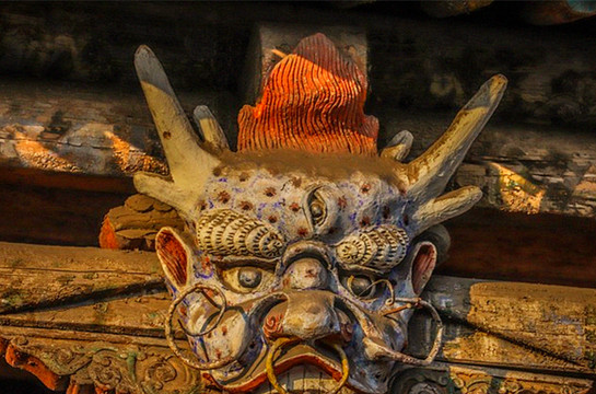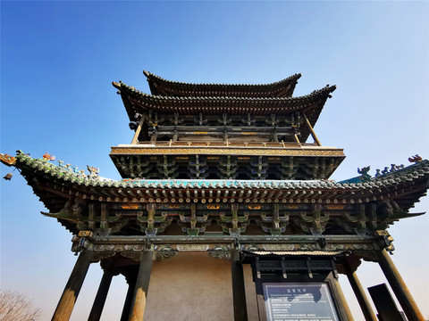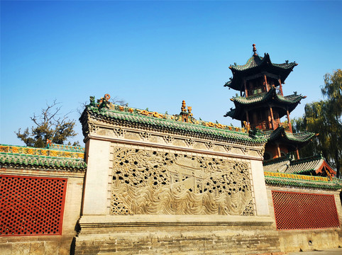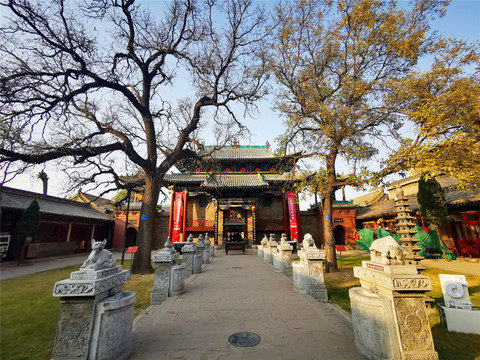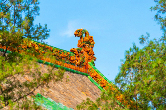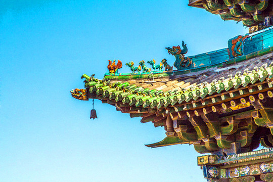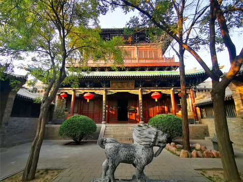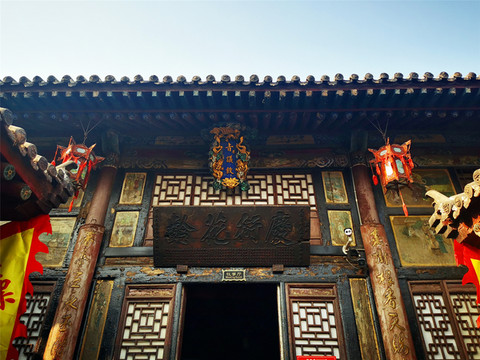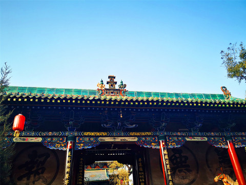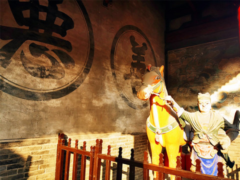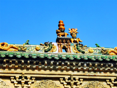离文庙不远就是平遥城隍庙,初建于北宋时期,明清两度重修,是目前中国保存最完整的城隍庙之一,走进城隍庙,就会注意到十二生肖柱和蓝色琉璃瓦,其中琉璃艺术是最大特色,满布殿宇屋顶的琉璃以蓝、绿为主,黄色相间,组成的青冷色调显出一种神秘的意境,仙人、走兽、龙吻造型精美,色泽如初,是清代琉璃工艺的杰出代表。