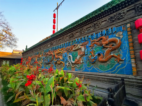 文庙的东北角有一处九龙壁,始建于明初,原为太子寺的山门照壁,是国内仅存的四座九龙壁之一,其余三座为北京紫禁城九龙壁、北京北海九龙壁、大同九龙壁,对比其他几座九龙壁,平遥九龙壁显得略为光泽暗淡,这是因为1977年平遥罕见特大暴雨造成了城内大量古建筑和城墙坍塌,其中也包括九龙壁,经抢救,仅获得了部分的琉璃构件,其辉煌程度大不如以前。