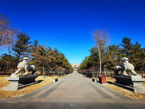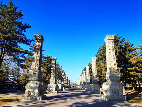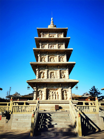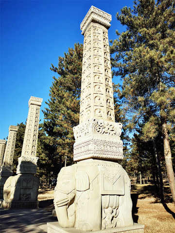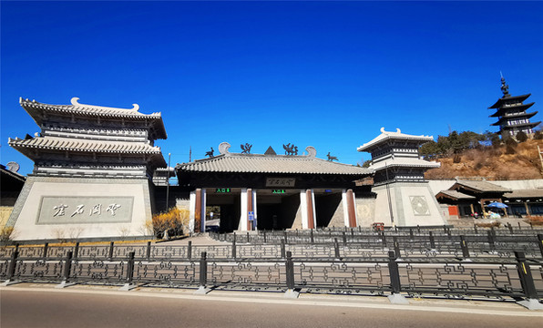 云冈阙门正门横脊上有北魏崇拜的太阳神鸟和三足乌,入口矗立一尊主持开凿者昙曜和尚的雕像,十三对“骑象四棱神柱”依次列于礼佛大道两侧,穿过神柱林立的礼佛大道,呈现于眼前的是两面相对的伞形皇家礼佛浮雕墙,这组正面相对的浮雕墙总体呈圆弧状,长约20米,以高浮雕的形式生动表现了北魏皇家盛大的帝后礼佛图,浮雕墙中心还有一颗金叶子菩提树为世人祈福,灵岩寺建在湖心岛上,中央石雕方形造像塔高达5层,每层有主佛像四面12尊,连同塔柱、佛龛周围的小佛像,数以百计。