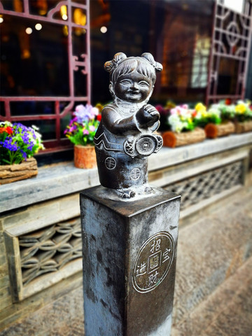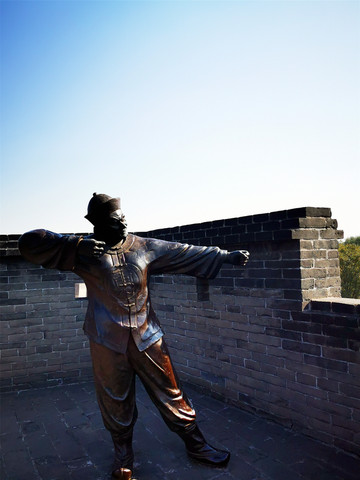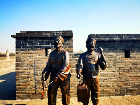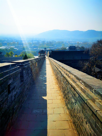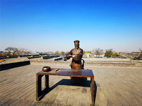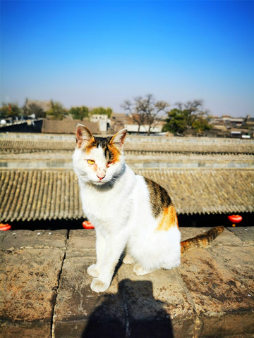 我们可以免门票进入二十二个小景点,凭预约码即可扫码入内,那就从最近的古城墙开始吧!平遥城墙共有六座城门:迎薰、拱极、太和、永定、亲翰、凤仪,迎薰门为南门,因迎纳东南方和薰之风得名,设有内外两道门,内为主城门,外为瓮城门,两道门中间为瓮城,近期因维修暂不开放。从迎薰门登上古城墙,登高望远,城下就是热闹的南大街,古城墙始建于明朝,是中国保存最好的古县城城墙,距今已经有600多年的历史,沿着城墙游走,古城的生活情貌尽在眼底,城墙上的雕塑再现了古时兵役打更搭弓等场景,更有官家屹立高处指点江山,但不知谁恶作剧在他手上敬了一根香烟,实在滑稽!游走之际,偶遇眼睛受伤的喵星人一枚,莫名与我投缘,任我爱抚,一路跟随,不离不弃……