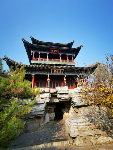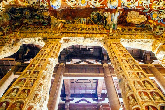 第三窟是云冈最大的洞窟,第五、六窟为一组双窟,窟前宏伟高耸的五间四层绕廊木构楼阁为清初顺治年间修建,被称为窟檐建筑,起到保护石窟的作用,以免石窟裸露被侵蚀,同时也美化了石窟,据专家考证,云冈石窟的大窟前均有窟檐,但多数因战争或其它因素毁坏,这组建筑朱红柱栏、琉璃瓦顶、巍峨挺拔、气势非凡,是明代云冈八景中的“云冈摩云”,窟内北壁坐佛高17米,是云冈石窟中最高大的佛像,后世包泥彩绘,呈唐代风格。