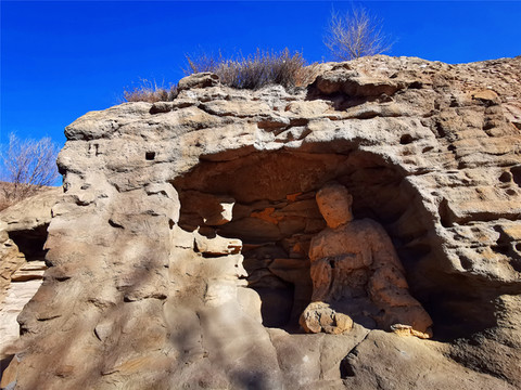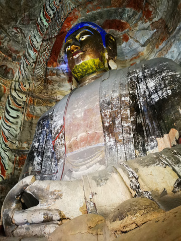 云冈石窟墙壁、佛像上有着或疏或密的洞孔,景区讲解如此解释:清代,云冈石窟进行了多次大规模的泥塑翻新及维修,在修补佛像时,采用传统的打孔、嵌入木栓、缠麻、涂泥、彩绘的办法,工匠把木桩打入佛像并固定,外覆泥塑彩绘,这种方式虽然对防风化起到一定保护作用,但却对石雕造成了极大的破坏,后期泥皮脱落,木桩枯朽,到如今便成了这番千疮百孔的样子。