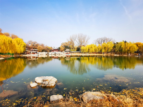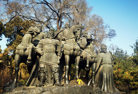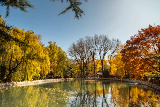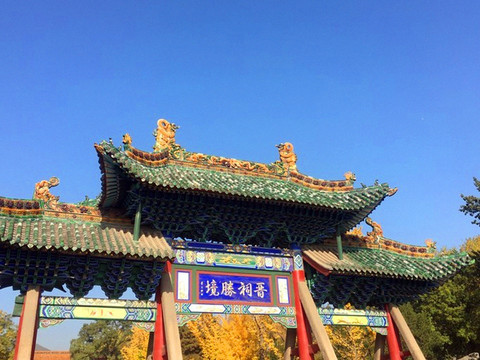 进入晋祠,首先要通过晋祠外围的晋祠公园,公园面积非常大,环境优美,秋色正浓,园内山环水绕,湖边倒影依依,林间奇石相叠,亭台楼阁相望,景色秀丽宜人,公园里的“龙兴晋阳”唐太宗李世民青铜群雕气派壮观。