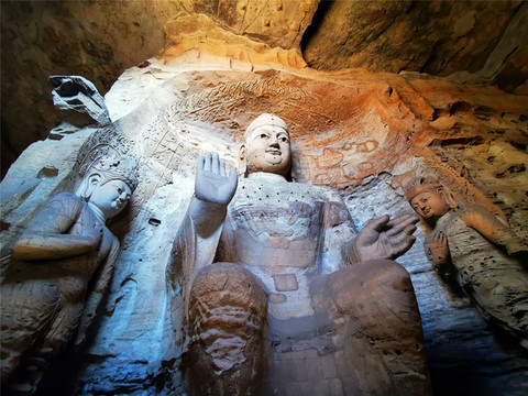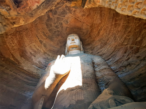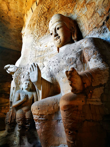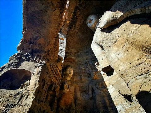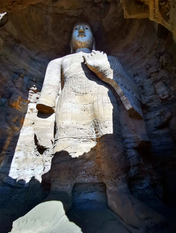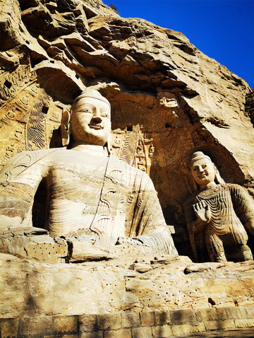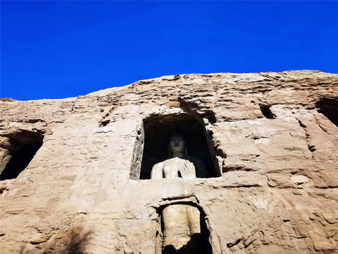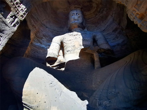 一是初创期(16-20窟,也叫昙曜五窟):高僧昙曜主持开凿了雄伟壮观的昙曜五窟,揭开了云冈石窟开凿的序幕,五窟规模宏伟,雕饰瑰丽,技法熟练,布局设计严谨统一,是中国佛教艺术第一个巅峰时期的经典杰作。为显示北魏皇帝权力的无限,“昙曜五窟”5个石窟的中央都雕刻了巨大的如来佛像,大佛个个都宏伟无比,身形高大挺拨,高鼻深目,大耳垂肩,象征了北魏五朝的五代皇帝,其中第20窟的大佛,主佛高13.7米,传说代表北魏文成皇帝,大佛挺拔健硕的身躯,气势雄浑的神情,突出表现了鲜卑游牧民族的强大,是云冈石窟雕刻艺术的代表与象征,也是中国早期佛教雕刻艺术的空前杰作,因地震导致外岩壁崩塌,成为唯一的露天佛像,意外成为云冈石窟最出名的形象代言人。