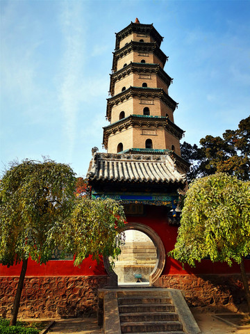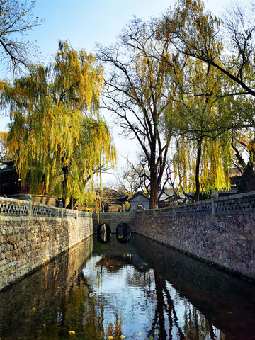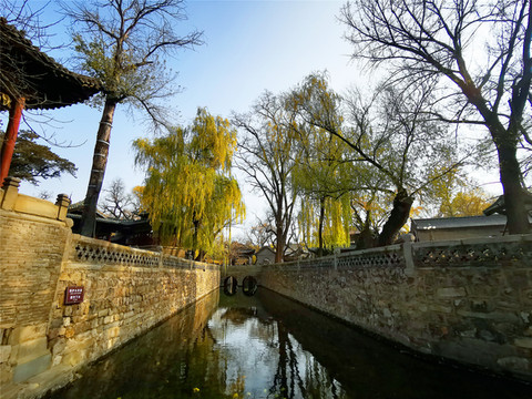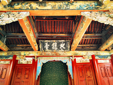 走进真正的晋祠大门,迎面看见的是一座明清时期的建筑——水镜台,这座看起来像庙宇的建筑,实际上却是一座戏台,面朝晋祠大门的一侧,是戏台的后侧,正中上方挂“三晋名泉”横匾,戏台的前侧悬挂“水镜台”匾额,是晋祠三大名匾之一,据说建造水镜台的时候,在台下埋有八口大缸,以达到扩音的效果。从后侧看水镜台,仿佛动画片里孙悟空变化的土地庙,两边的圆形窗户好像是孙猴子的两只火眼晶晶,感觉下一秒就会滴溜溜乱转或是忽闪。