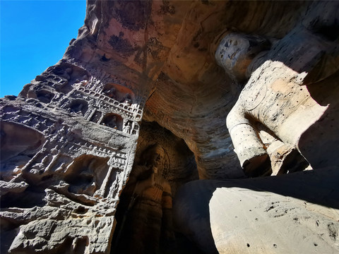 二是高峰期(1-13窟):是云冈石窟雕凿的鼎盛阶段,也是北魏最稳定、最兴盛的时期,云冈石窟集中了全国的优秀人才,以其国力为保证,进而雕凿出更为繁华精美的大窟大像,它所呈现的内容繁复、雕饰精美的雕刻艺术特点大异于早期石窟,雕刻造型追求工整华丽,从洞窟形制到雕刻内容,风格均有明显的汉化特征。