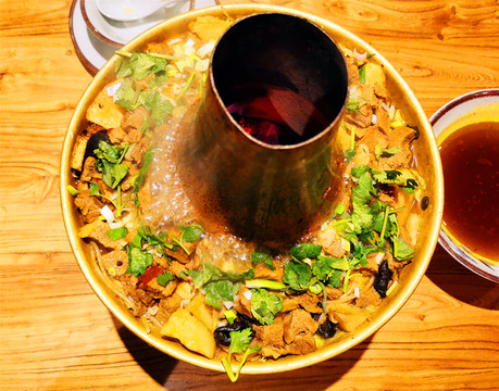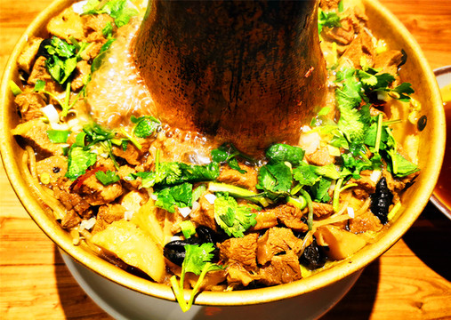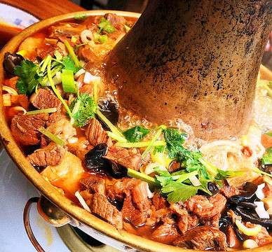 午间拼车返回平遥古城,车停西门外,我们慢悠悠重回南大街,先去客栈推荐的“人在北方”餐馆试试牛肉铜火锅,店家贴心请我们喝他们自制的油茶,但我喝不惯。店里小伙服务超级热情,听说都是被“海底捞培训过的”,牛肉铜火锅上来时咕嘟咕嘟冒着热气,卤得入味的牛肉多到看不见其他配菜,蘸着自家醋吃起来尤为美味又解腻,吃了身子暖暖的,再翻翻还内有乾坤,下面藏有很多烩菜,土豆、豆腐、大白菜、粉条,分量很大,热腾腾的超级好吃,一份锅子直接把两个人就吃撑了(部分网络借图)。
