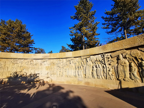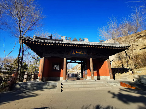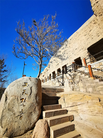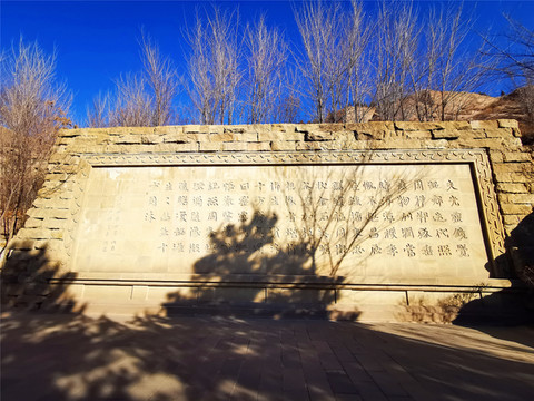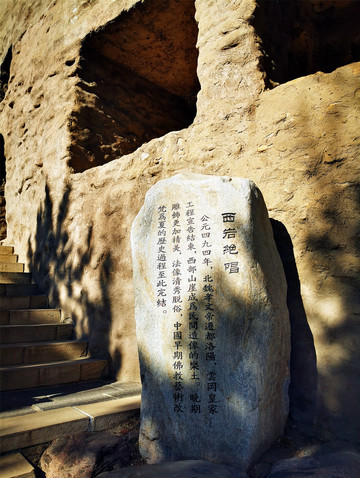 穿过灵岩寺之后,才是云冈石窟的真正大门,石雕照壁墙“比丘尼昙媚造像记”,石刻原件是1956年在整修云冈第20窟时,在窟前的积土中发现的,书体据说是魏碑早期的风格,中国魏碑书法的源头。