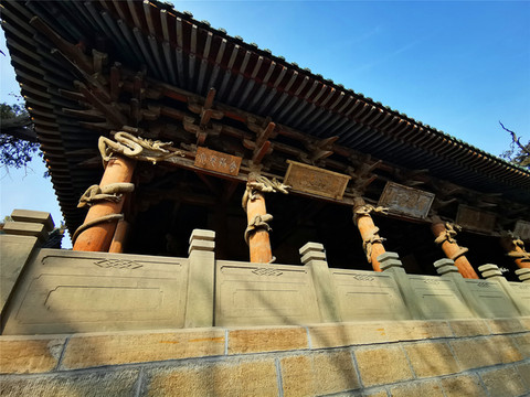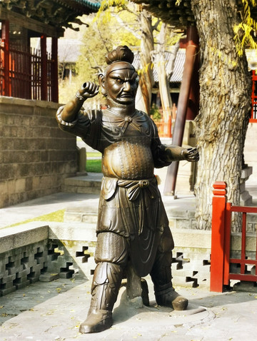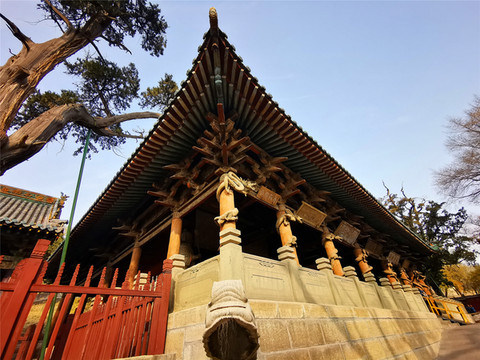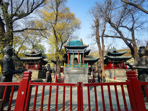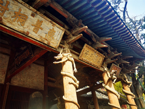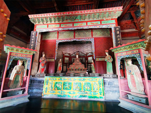 后方的主殿就是晋祠三宝之圣母殿,是晋祠的主殿,创建于北宋天圣年间,是中国宋代建筑的代表作,为奉祀邑姜所建,是晋祠三宝中价值最高的一处。圣母殿正面的八根大柱子上,各抱有一条木雕蟠龙,皆为北宋时期原物,这些蟠龙虽已有近千年历史,但依然怒目利爪、鳞甲须髯、霸气十足,让我颇为震惊,绕梁端望许久,仍觉人间极品,堪称奇迹。圣母殿正中的匾额之下,横匾上书“三晋遗封”,据说是清代慈禧太后的御笔,前廊正中悬挂的匾额“显灵昭济圣母”,是北宋原物,据说为宋仁宗所题,在殿前廊左右两侧,各有一座高约四米的将军像,亦是宋代原物。
