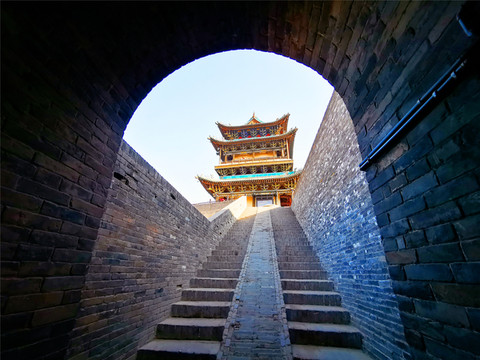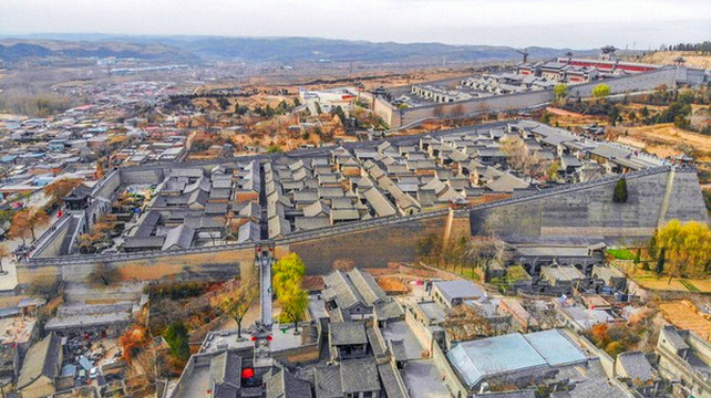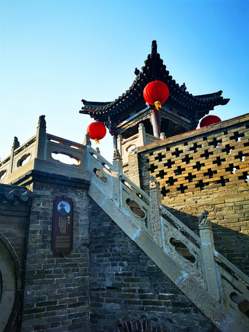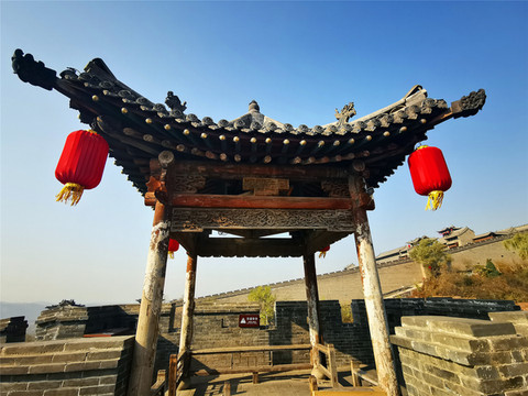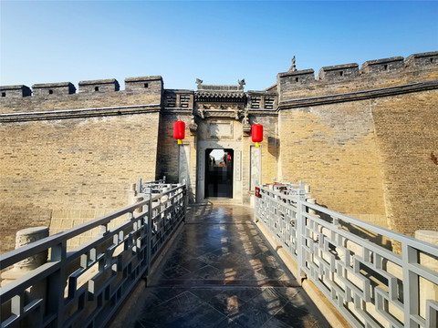 与高家崖建筑群相对峙的是红门堡建筑群,红门堡主要是当年王家长辈世代居住的地方,两堡之间以桥相连,是典型的北方全封闭城堡式建筑群,城墙依山坡绵延而起,最高落差达28米,城内层楼叠院,历经54年建成,堡内南北向有一条用大块河卵石铺成的主街,称“龙鳞街”,主街将西大院划为东、西两大区,东西方向有三条横巷,横巷把西大院分为南北四排,建筑布局隐一个“王”字,充分体现了古老的大商家族的震慑与威严,登上城墙最高处,转身俯瞰,堡内全景和静升古镇的风貌尽收眼底。