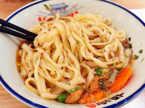 抵达太原,已是傍晚时分,酒店订在热闹的长风街附近,晚上先去尝尝山西刀削面。中国有五大面食:山西刀削面、河南烩面、四川担担面、北京炸酱面、武汉热干面,也有人认为应该包括兰州拉面和陕西biangbiang面,但无论哪种说法,刀削面都是排在首位的,顺溜削面是山西特色连锁面馆,颇有名气,面条很劲道。