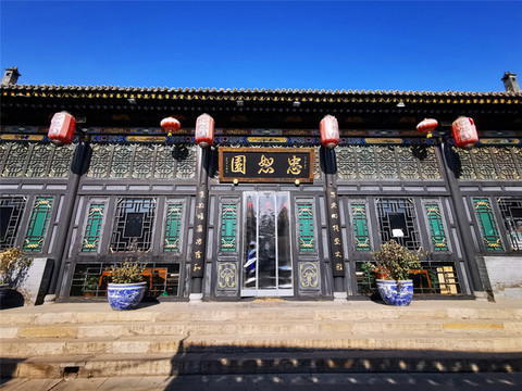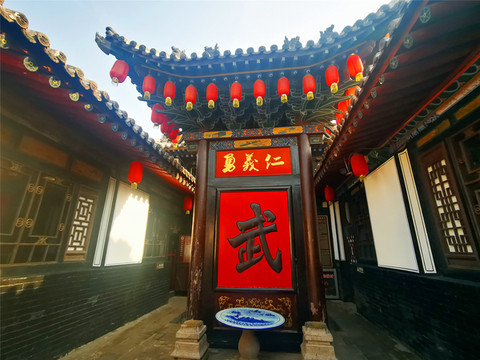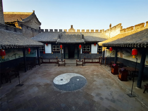 汇武林原为清末民初平遥著名八卦掌拳师王伦的旧居,是南北各地内外拳师以武会友、切磋技艺的场所,现为传统武术陈列馆,集镖局与教场于一身,浓缩了平遥古城的武术文化,更是弘扬中华武术文化教育的一座平台。武馆三进院落,正屋上悬金匾“海纳百川”,绕过正房,后面就是演武场,操场地势平坦,地面中间还嵌了个太极图,江湖比武氛围浓厚,站在太极图中央,感觉自己就置身武场,很想耍套太极拳法,与江湖高手们切磋一二!
