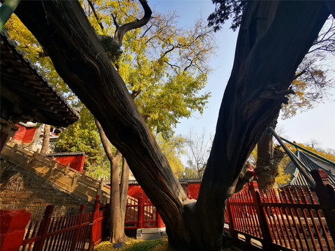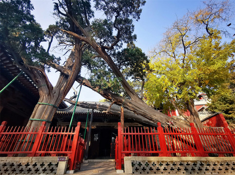 晋祠三绝之周柏,晋祠内古木众多,其中树龄最长(3000岁)的,当属圣母殿北侧的一株周代古柏,古柏与地面呈45度夹角,倾斜依靠于圣母殿的殿顶,枝叶常青,像只苍龙俯卧其中,更神奇的是,不知何年在这棵卧柏的下方又长出一棵翠柏,支撑住了倾斜的古柏。