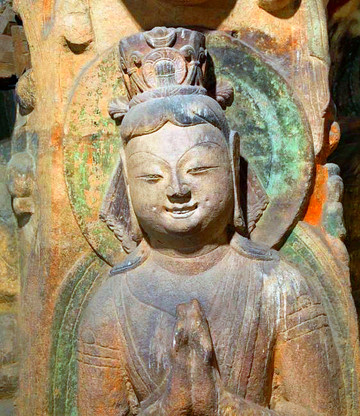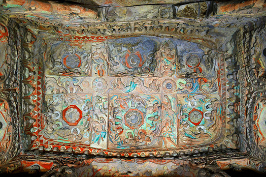 第七、八窟是云冈最早的双窟,窟顶摹仿木构建筑中的平棊藻井,24对飞天围绕盛开的莲花飘然曼舞,还有石窟唯的一露齿微笑菩萨,第九~十三窟俗称“五华洞”,因后世施泥彩绘而异常绚丽(部分网络借图)。