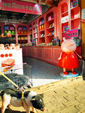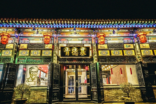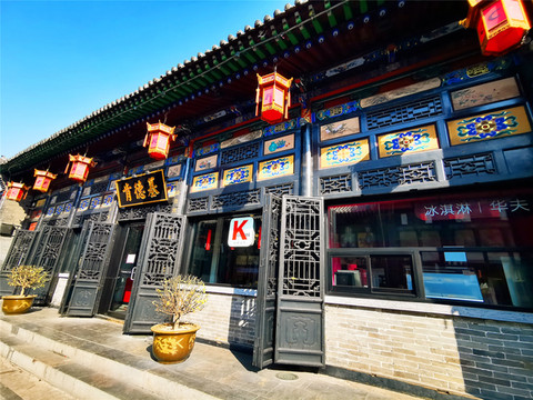 平遥古城的交通脉络由纵横交错的四大街、八小街、七十二巷构成,南大街,又称明清街,是平遥古城对称式格局的中轴线,曾是古城最繁华的商业中心,清朝时期南大街上曾控制着全国50%以上的金融机构,被誉为 “中国的华尔街”。远处是古市楼,三重檐木构架楼阁,古城最高建筑,近处是人流如织的古城街道,街道两侧现存有大量百年以上、独具明清风格的古民居建筑,连洋快餐KFC、网红的瑞幸咖啡也入乡随俗,店面古色古香,只是卖猪肉脯的几户粉红店家,家家都有一只小香猪驻店吸引大家的目光,这与古城氛围确实有点格格不入。