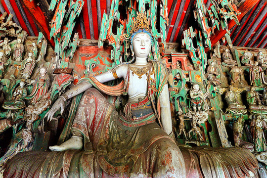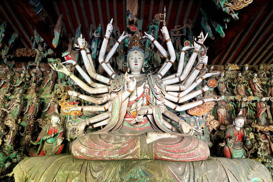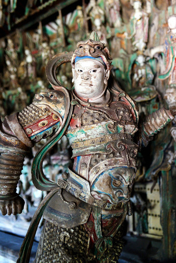 去高铁站途中经过双林寺,这是被列入《世界遗产名录》中的古寺之一,始建年代已无从考证,现存庙宇全为明清两代建筑,寺中存有两千余尊由宋到清代各朝的彩绘泥塑,件件皆为稀世珍宝,为中国元明两代彩塑的精华所在。东侧殿内主尊为自在观音像,为双林寺彩塑经典之作,然而菩萨的风头却被身旁的韦陀抢走,这尊韦陀像,身高不足半米,却被誉为天下第一韦陀,是整座双林寺乃至全国彩塑作品中的巅峰之作,被誉为“全国韦陀之冠”,西侧殿内主尊为千手观音,手势千变万化。
