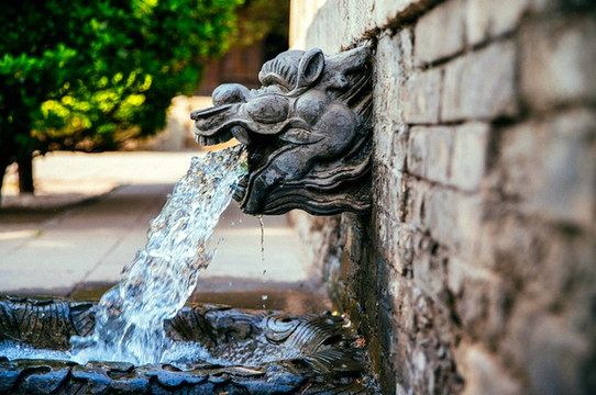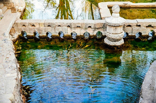 晋祠三宝之难老泉,有“晋阳第一泉”之称,其匾额亦为晋祠三大名匾之一。难老泉至今仍是晋水的主源,泉水冬温而夏凉,碧玉般清澈,不分旱涝,奔涌不息,水从难老泉涌出后,从龙口流入一汪清潭,潭中有一道石堰,上有十个直径相等的孔,泉水于此分为两股,南三北七,所以叫做“三七分流”。