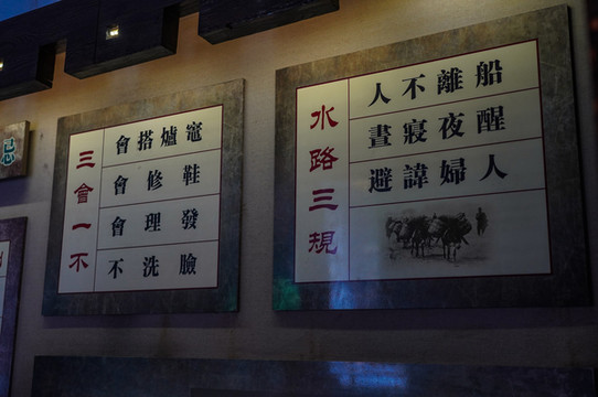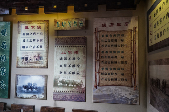 其中有一个专门的展室是有关镖局禁忌的介绍:“镖师三忌”,“三不住”,“住店三要”,“三会一不”,“水路三规”……都是无数次血的教训所积累下来的宝贵经验,饱含着历代镖师的感悟和智慧,无不令人遐想,令人赞叹。
