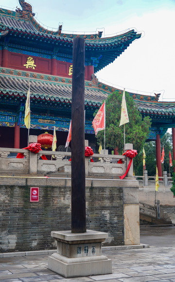 殿前有两根木柱,是华表的前身“诽谤木”。尧初设立诽谤木,人们把意见写在上面或者敲击出声,他便出宫当面听取意见,以便改进政务,是古时信访工作的开端。现在演变为雕刻着精美盘龙图案的“华表” 石柱 。