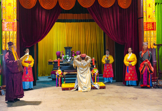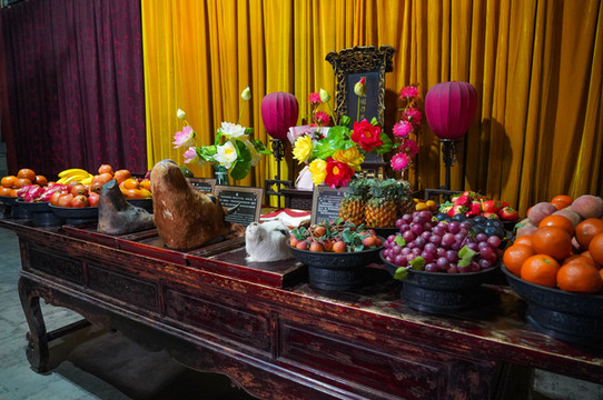 导游还会给我们讲解传统的“传统祭祀”的具体流程,“迎请神主”“敬香通神”“典帛安神”“敬献供品”等九项传统仪。
