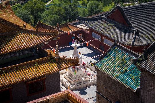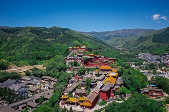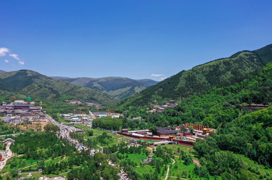 俯瞰整个五台山的寺庙群,庙宇色彩艳丽,山景雄伟壮丽,人文与自然景观绝美。人文景观主要由青庙和黄庙两大部分构成,庙宇建筑景点较多。