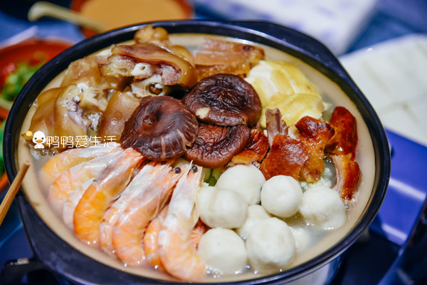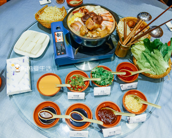 客家大盆菜,可以根据人数来安排,一人是128元,一个大土锅,里面满满的有猪脚、虾、豆腐等等,涵盖山珍海味。酱料也有10钟,自助拿取。