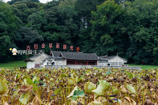 宗祠后面树立着“古田会议永放光芒”八个大字,现在还在荷花田边上设了一个拍照台,游客可以在这个角度拍下整个全景。