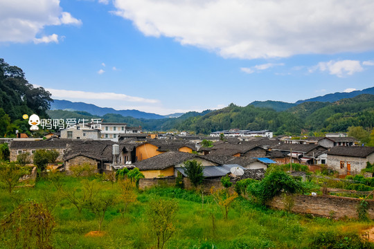 没有无人机,从村口边上的高地拍下一张古村的半幅全貌,青砖白瓦与蜿蜒曲折的道路,远处青山蓝天白云构成了一幅和谐的画面。