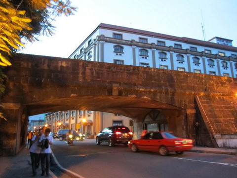 我赶在六点豪宅闭馆才从它门口出来,临走,还和西班牙士兵装扮的馆内工作人员合影留念。出来照了几张街景,我还去哪儿?我径直向前走,这一带街景和房屋有比宿雾优雅的建筑,前面看见一座更高大的圆顶大教堂,又进去看了一眼,它确实高大,如果我有时间我会坐下来听听上帝说什么,可是天已近黄昏,我碰上一个三轮车夫,这家伙看上去机灵,他们这些人每人手里都拿着一副过过塑的照片,全是旧马尼拉城的古迹景点,他说转一圈全部景点看完三百比索,确实不贵,而且又带了路,不必自己到处跑到处找,可是我说我马上要回机场了,我只能看一二个就近的,他依然不放过我,说你选一个50比索,我说那就去圣地亚哥城堡吧,我坐上车,刚坐上去转了一个弯不到一分钟,他就停下来说到了,啊!你这50比索原来就是个指路费啊?呵呵,真够蒙人啊,而且古堡已经关门了,我有点不甘心,我笑着说:你还没劳动呢就收钱啊?后来他说那你再选一个,我就选了一个有点像罗马斗兽场圆形的建筑物,他也只骑几分钟就到了,好了,给了他一百比索,本来这里也关门了,也许是他说了一句什么,看门的就让我免费进去看了一分钟,这是一个圆型半地下建筑,我还不知道是怎么个来由,只好先拍下门口的英文指示牌——它名为“Baluarte de San Diego”,以后再研究。
