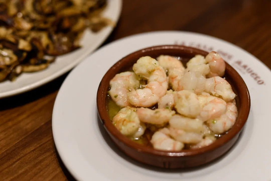 每家酒馆都有自己的招牌菜。百年老店La Casa del Abuelo即使已在马德里开了三家分店,饭点儿依然座无虚席,人满为患。蒜爆虾是每桌必点的菜品,端上来时热油仍噼啪作响,将蒜粒烘托得四溢芳香,超级新鲜的虾仁Q弹香甜,吃完忍不住要拿面包抹抹盘子作为结束仪式。