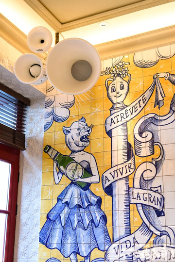 我们习惯性称之为狮子庭院餐厅,离阿尔卡拉大拱门(Puerta de Alcalá)只有几步之遥,这家餐厅结合了阿尔汗布拉宫核心景点——狮子庭院的装修风格,在阿拉伯人的瓷砖烤画上再做了创意,将一些真理名言嵌入其中。转角的楼梯是打卡的人们角度,楼下一层的洗手间,大面积的玻璃延展了视觉空间,水龙头甚至复刻了狮子庭院的样子,由不得你不驻足。
