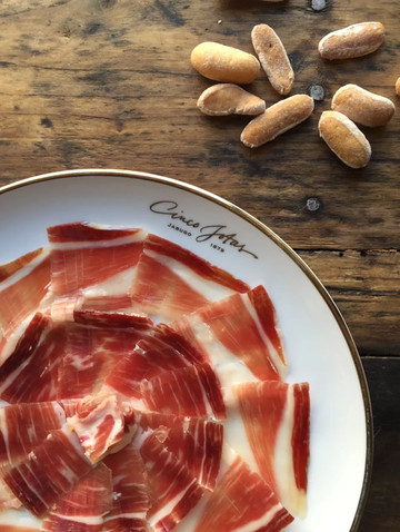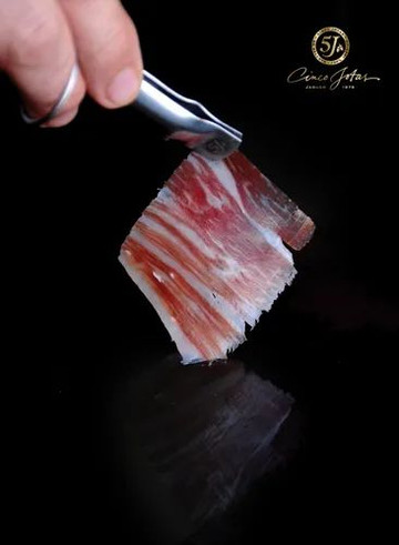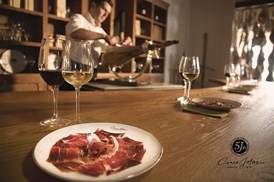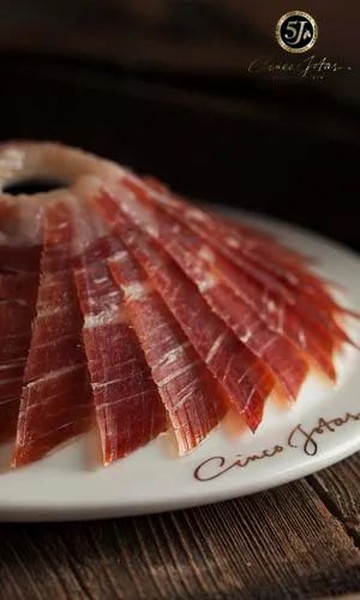 5J Cinco Jotas源于 1879年, 隶属于Osborne集团公司,是西班牙国宝级火腿, 代表着质量最顶级的伊比利亚火腿。历来是顶级质量的代表。他们在马德里时髦的萨拉曼卡街区(Salamanca)开设了同名餐厅,需要预定才能落座。