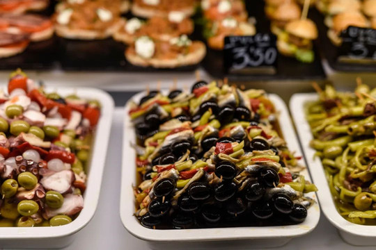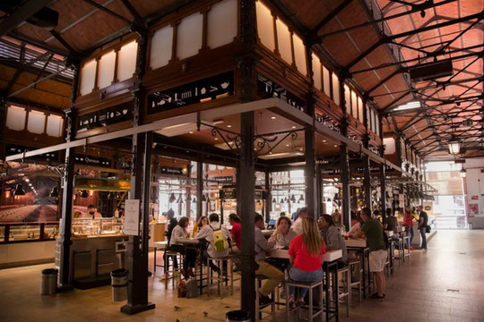 除了购买选购食材,很多人也来此品尝地道的西班牙小吃——西班牙人习惯站着吃小食,市场里设有多张高脚圆桌,供人们站着品尝小吃。开瓶红酒,配上地道的tapas小酌一杯,享受马德里街道上喧闹也是好体验。