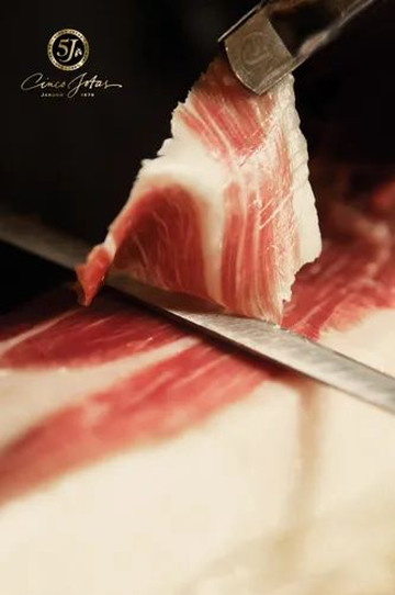 一份上好的顶级火腿关键词是:5J——5个字母“J”代表5项要求和重要价值:100%的伊比利亚纯种猪、源自哈布果镇、橡果喂养并在牧场中自由式放养、先进工艺加工并贮藏、整个过程均由火腿制作大师监控,用5年的时间完成自然发酵,这样才能被认为是正宗的100%伊比利亚火腿。