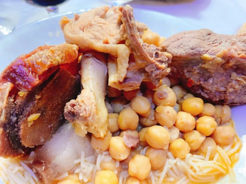 餐厅深谙了中国炖汤的精髓,吃得人心满意足的:老母鸡肉、牛肉、肥猪肉、腊肠、火腿等和鹰嘴豆混在一起加水炖上几个小时直到入味,然后把原料与汤分开。炖汤中加入细碎的意面,煮上十来分钟至熟,盛到汤碗中做头道,之前捞起的食材则作为二道,煮烂得入口即化,精华都留在汤和豆子里了。菜品分量还特别大,一个人想吃完,简直是不可能的事儿,哪怕我们队伍里有1.9米的高个子小伙儿。